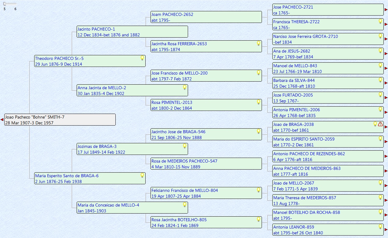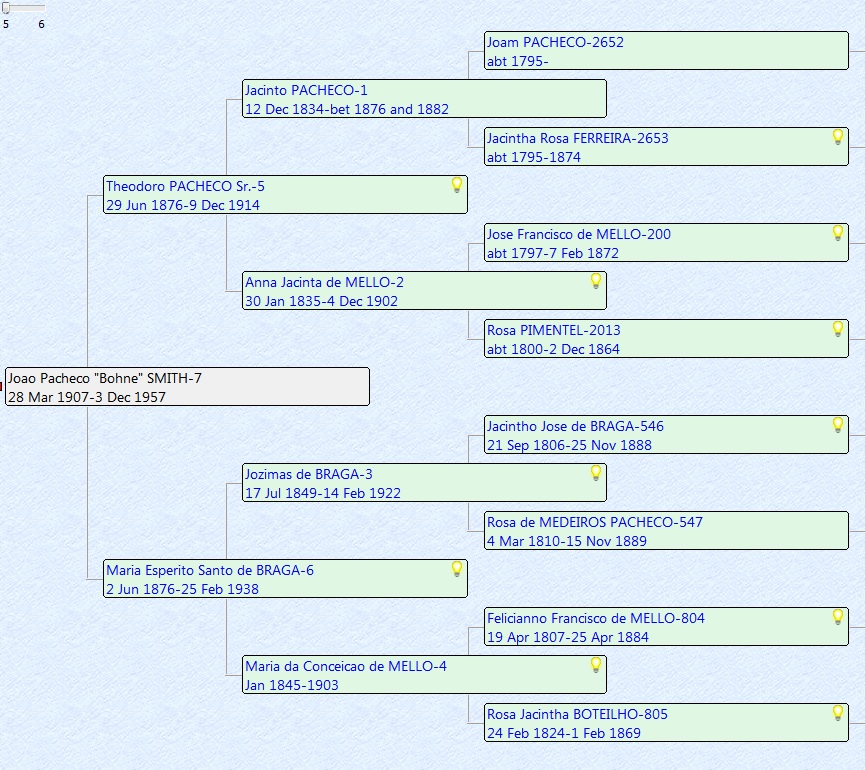 Now, let’s see what happens when we look at his grandmother, Rosa’s, tree. Her surname is Medeiros Pacheco. Her father’s was Pacheco de Rezendes. Her mother’s was Pacheco de Medeiros. Not too bad. She took her mother’s surname and reversed it (or the Priest messed it up).