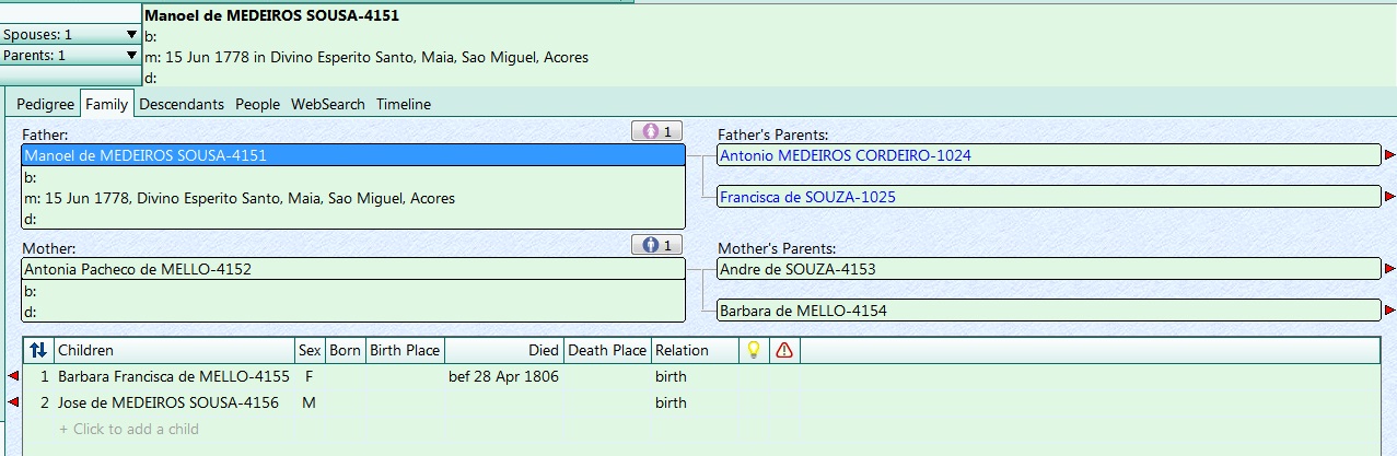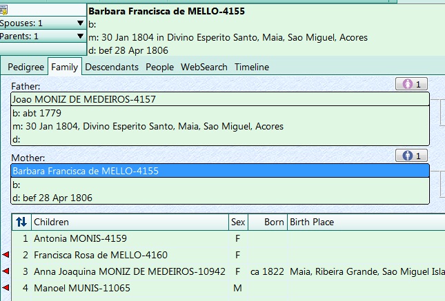 I’m going to show you some examples. You can click on each image to see larger versions. This is a screen shot from RootsMagic of my grandfather’s family tree. Both sides of his tree are from Sao Miguel Island. In this example, you can see that the surnames are consistent, except for Joao’s. That is a story for another day.
